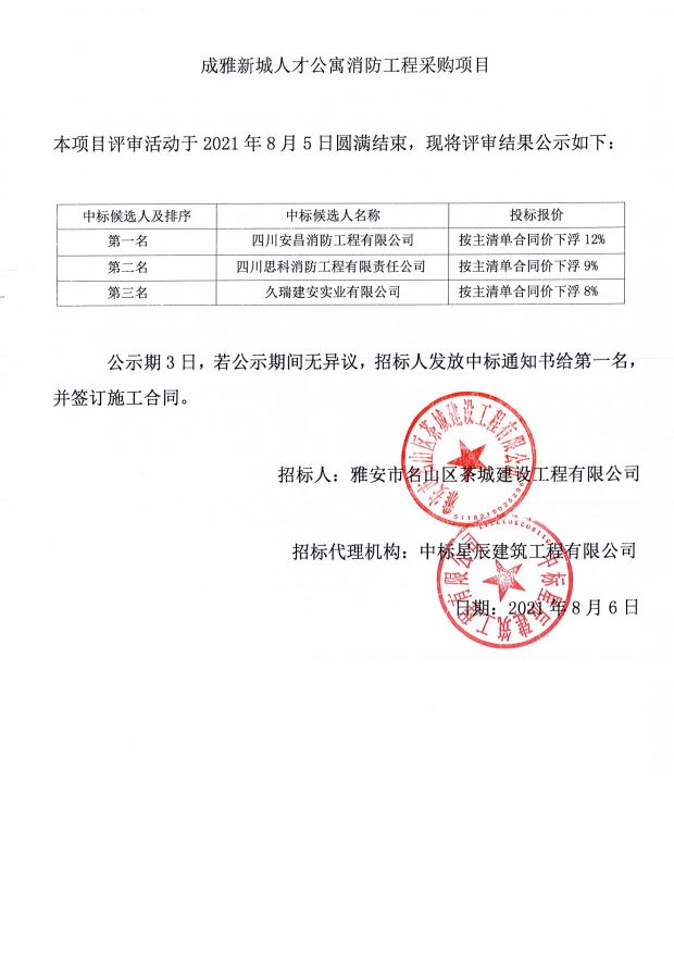 成雅新城人才公寓消防工程采購項目中標(biāo)公示