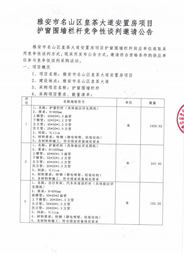 雅安市名山區(qū)皇茶大道安置房項目 護窗圍墻欄桿競爭性談判邀請公告